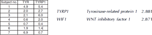 Observed increase of the levels of TYR and TYRP1 enzymes in seven people (left) and the total increase of the TYRP1 and WIF1 genes in a group of 18 women. Journal of Investigative Dermatology (2011) 131, 1692–1700;